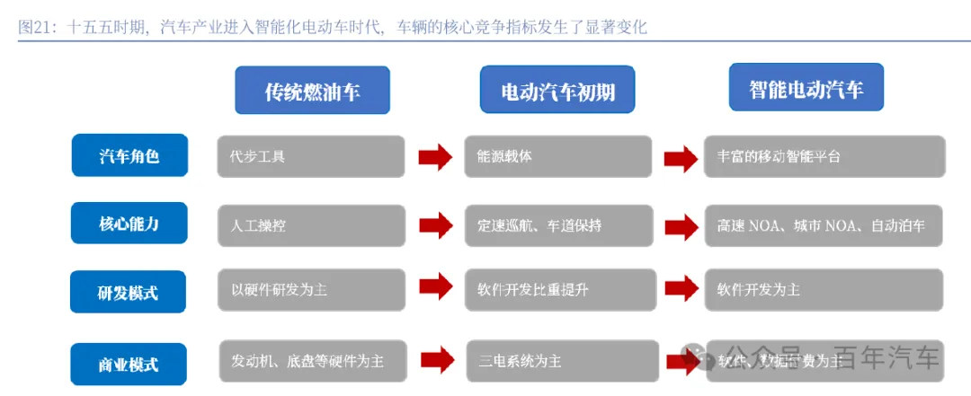 智能化正從附加功能蛻變?yōu)槠嚫偁幍暮诵膭儇撌帧T诋斚缕嚠a(chǎn)業(yè)的宏大變革之中,智能化正無可阻擋地成為競爭的核心要素,深刻重塑著汽車行業(yè)的格局與未來走向。區(qū)別于燃油車時代的發(fā)動機、變速箱和底盤,電動車時代的三電系統(tǒng)成為汽車的核心技術壁壘。而進入智能化時代后,三電系統(tǒng)解決了“動力替代”問題,是智能車實現(xiàn)智能化的前提:沒有高續(xù)航、高安全的電池,智能駕駛的長途場景無法落地;沒有高精度的電控系統(tǒng),智能座艙的多設備能耗管理難以實現(xiàn)。但隨著三電技術已度過“從0到1”的突破期,進入“從1到100”的精細化競爭階段,AI賦能的智能駕駛和智能座艙將成為智能車時代的核心技術。智能化的增值邏輯在于AI重構了汽車各部分的價值占比,智能車中軟件及相關服務的價值占比不斷提升。