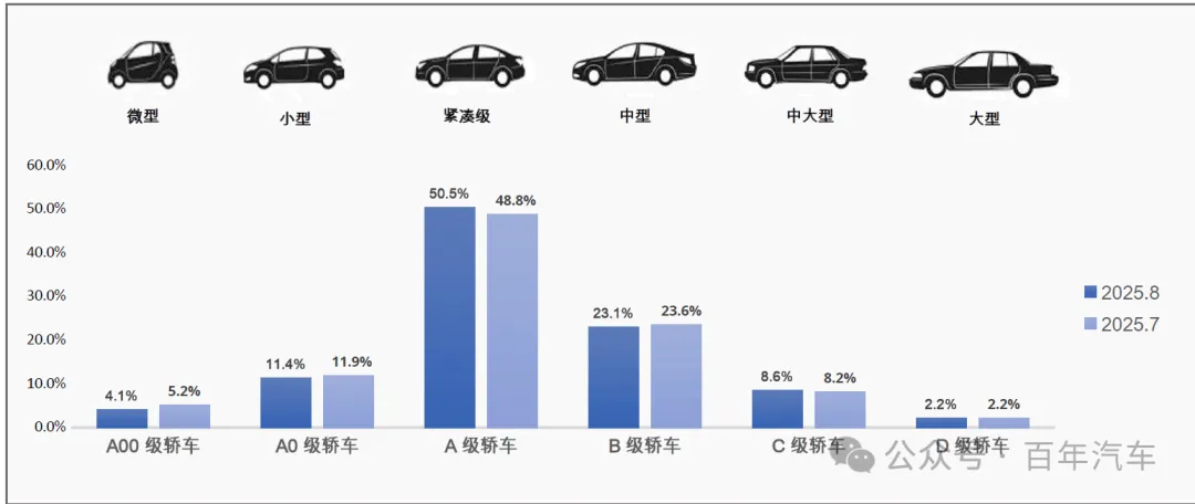 2025年8月,各級別轎車的整體銷量來看, A級轎車依舊是最熱銷的車型,占比為50.5%,環(huán)比增長1.6個百分點;其次是B級轎車占23.1%,環(huán)比下降0.5個百分點; C級轎車占8.6%,較上月增長0.4 個百分點。 A0級轎車占11.4%,環(huán)比下降0.4個百分點。A00級轎車占4.1%,環(huán)比下降1.1個百分點。