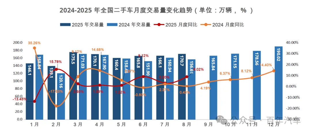 2025年8月,全國二手車市場交易量170.74萬輛,環(huán)比增長2.80%,同比增長9.02%,交易金額為1065.17億元。