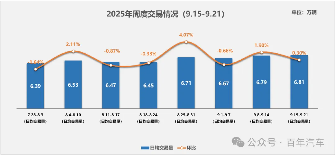 2025 年 9 月 15-21 日,全國二手車市場交易活躍度持續(xù)釋放,日均交易量達(dá) 6.81 萬輛,環(huán)比上周增長 0.3%,較 8 月同期增長 5.6 % 。截至 9 月 21 日,全國二手車?yán)塾嫿灰琢窟_(dá) 121.6 萬輛,較 8 月同期增長 4.5% 。預(yù)計9 月全月交易規(guī)模將達(dá) 177 萬輛,環(huán)比 8 月實現(xiàn)穩(wěn)步增長。