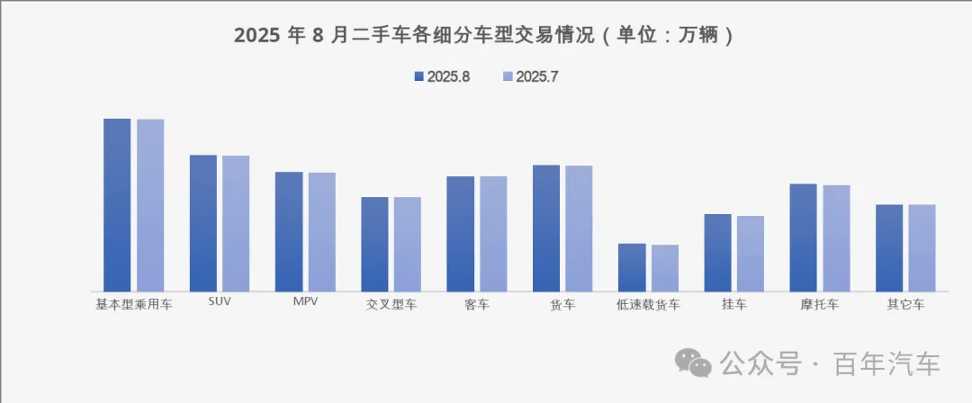 2025年8月,全國二手車市場交易量170.74萬輛,環(huán)比增長2.80% ?;拘统擞密嚬步灰?5.30萬輛,環(huán)比增長3.13%,同比增長6.88%;SUV共交易22.50萬輛,環(huán)比增長3.49%,同比增長6.37%;MPV共交易11.38萬輛,環(huán)比增長3.11%,同比增長12.88%;交叉型乘用車共交易4.20萬輛,環(huán)比增長1.46%,同比增長5.40%。