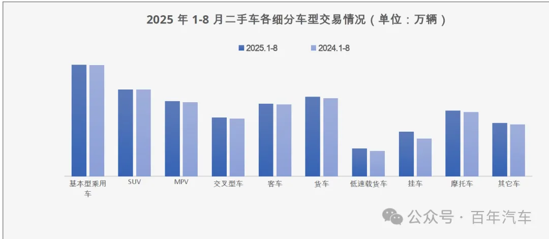 2025年1-8月,二手車?yán)塾嫿灰琢?293.84萬輛,同比增長3.03% 。乘用車?yán)塾嫿灰?019.41萬輛,同比增長1.43%。其中:基本型乘用車?yán)塾嫿灰?30.89萬輛,同比增長0.52%;SUV 共交易170.99萬輛,同比增長1.55%;MPV共交易84.93萬輛,同比增長6.79%;交叉型乘用車共交易32.60萬輛,同比增長8.74%。