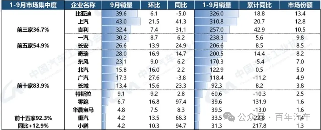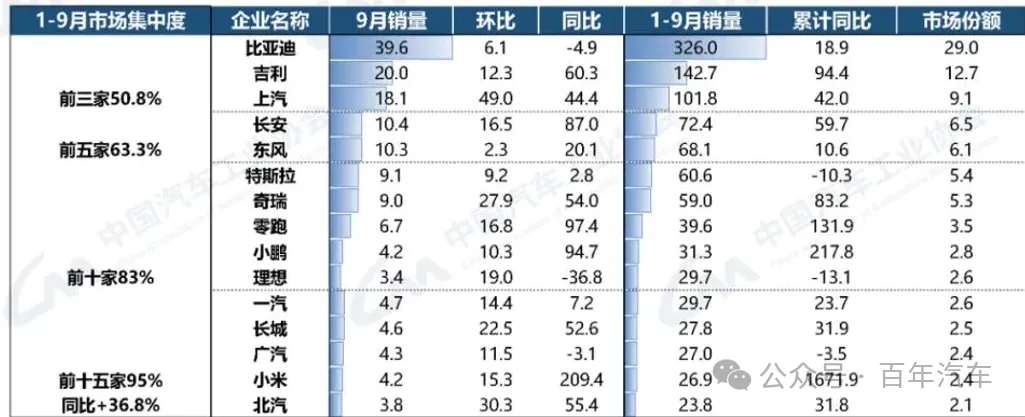 1-9月,新能源汽車銷量排名前十五位的集團銷量合計為1066.6萬輛,同比增長36.8%,占新能源汽車銷售總量的95%,高于去年同期1.3個百分點。