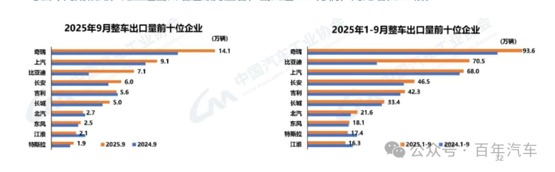 ■9月,整車出口前十企業(yè)中,奇瑞出口量達14.1萬輛,同比增長29%,占總出口量的21.6%。與去年同期相比,比亞迪出口增速最為顯著,出口達7.1萬輛,同比增長1.2倍。